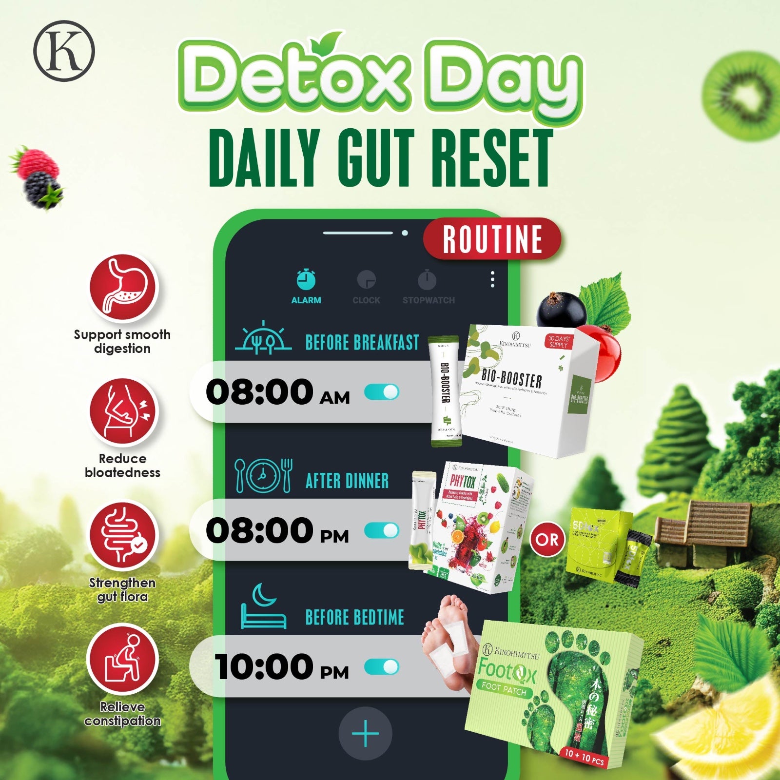 Detox Inside & Out: Feel lighter, brighter, and rebalanced in just days. A complete reset in 3 easy steps. Flush out toxins fast with Phytox, recharge your gut with Bio-Booster, and unwind with the Footox Patch overnight. Whether you're fighting fatigue, bloat, or stress—this bundle is your shortcut to feeling like new from head to toe.
